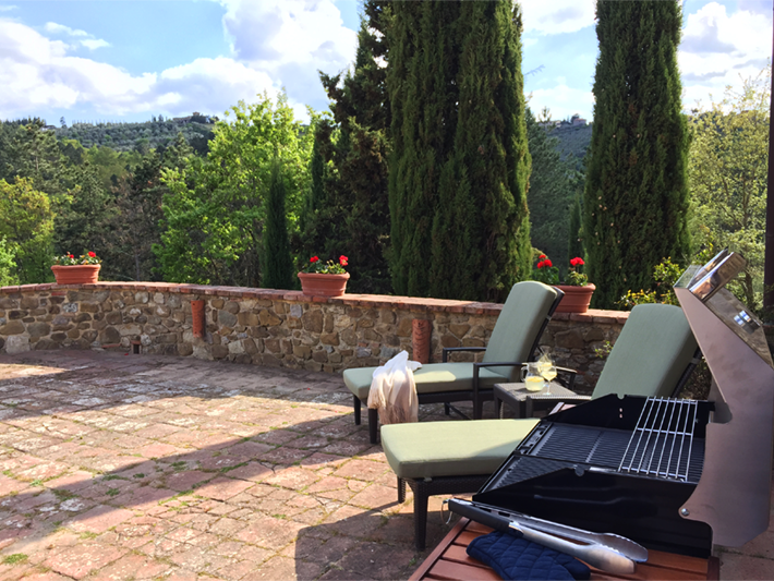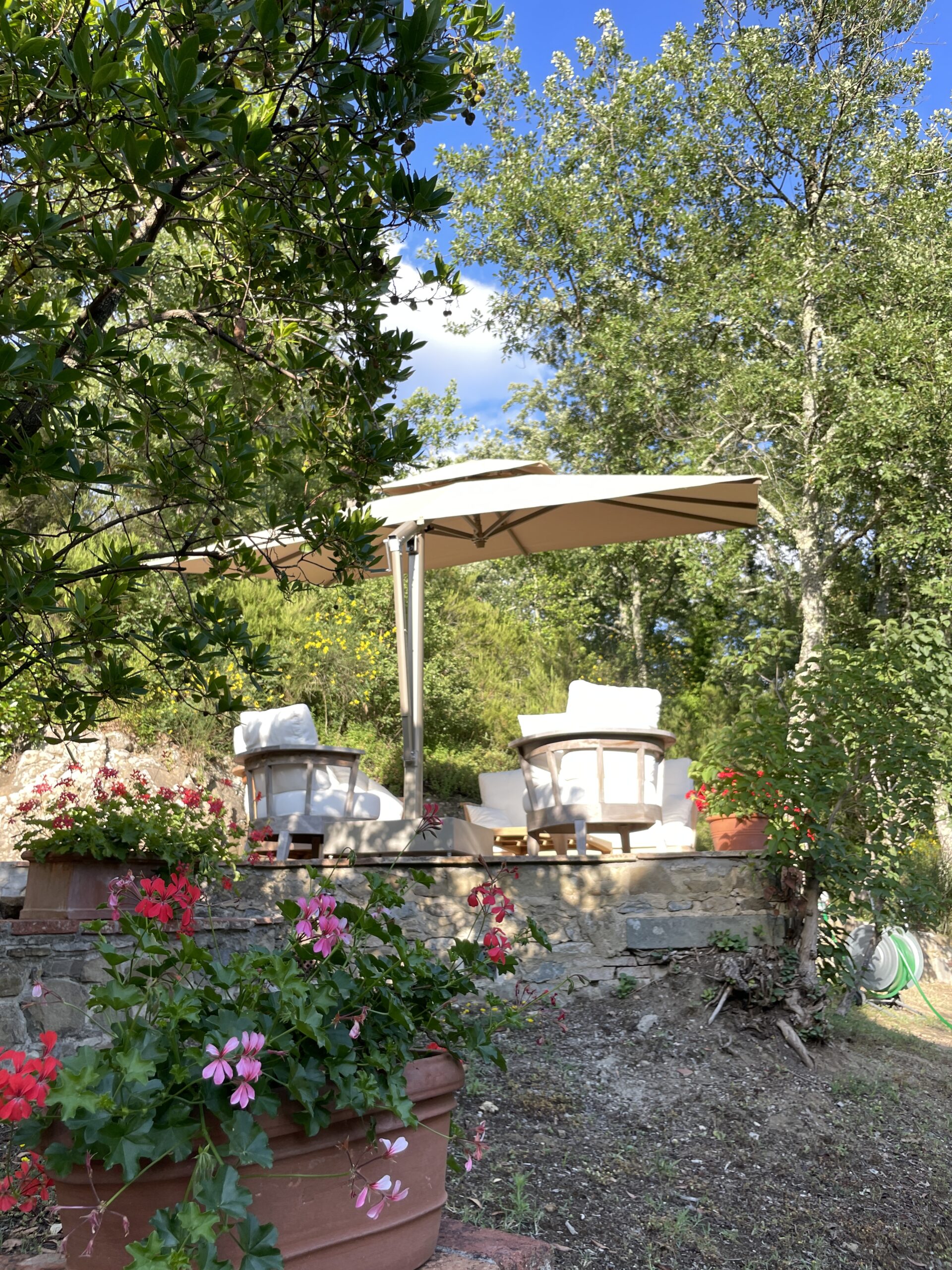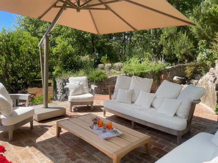 Above the formal garden is a charming upper terrace with stunning views over the Tuscan countryside. Furnished with two large sofas, two armchairs, a large coffee table, side table and large 3m x 4m Poggesi umbrella, it is a perfect place to retreat with a book any time of day or to gather for a pre-dinner aperitivo or to stargaze at night.