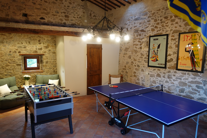 Just inside L’Aiaccia’s entrance gate is a small barn, “Il Fienile,” which has been converted into a Games room complete with Ping Pong and Foozball tables and bathroom (which can be easily accessed from the pool as well). Don’t miss the spectacular wrought iron flag-bearing dragons or the one-of-a-kind wrought- iron dragon chandelier overhead!