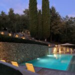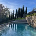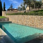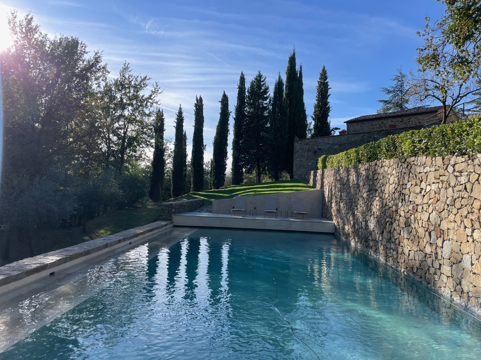 Taking advantage of the unique topography of Chianti, our stunning 15-meter x 5-meter pool is built into one of the property’s ancient olive grove terraces below the house. The pool is flanked on one side by a 5-meter tall stone wall and on the other side by a submerged walkway that extends from one end of the pool to the other.
