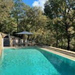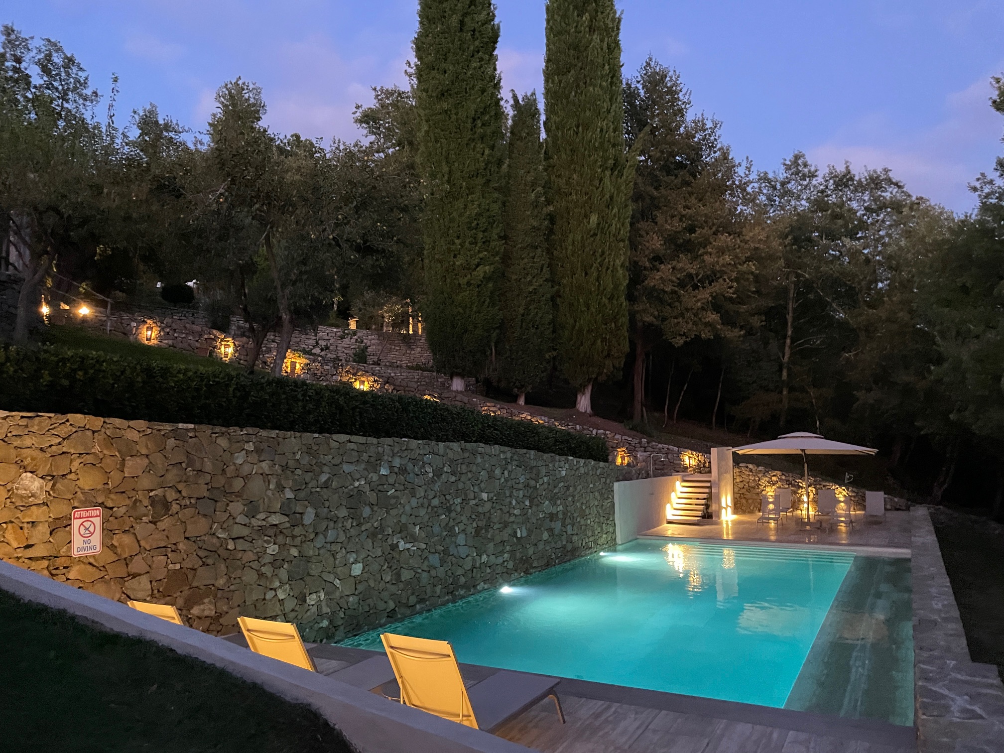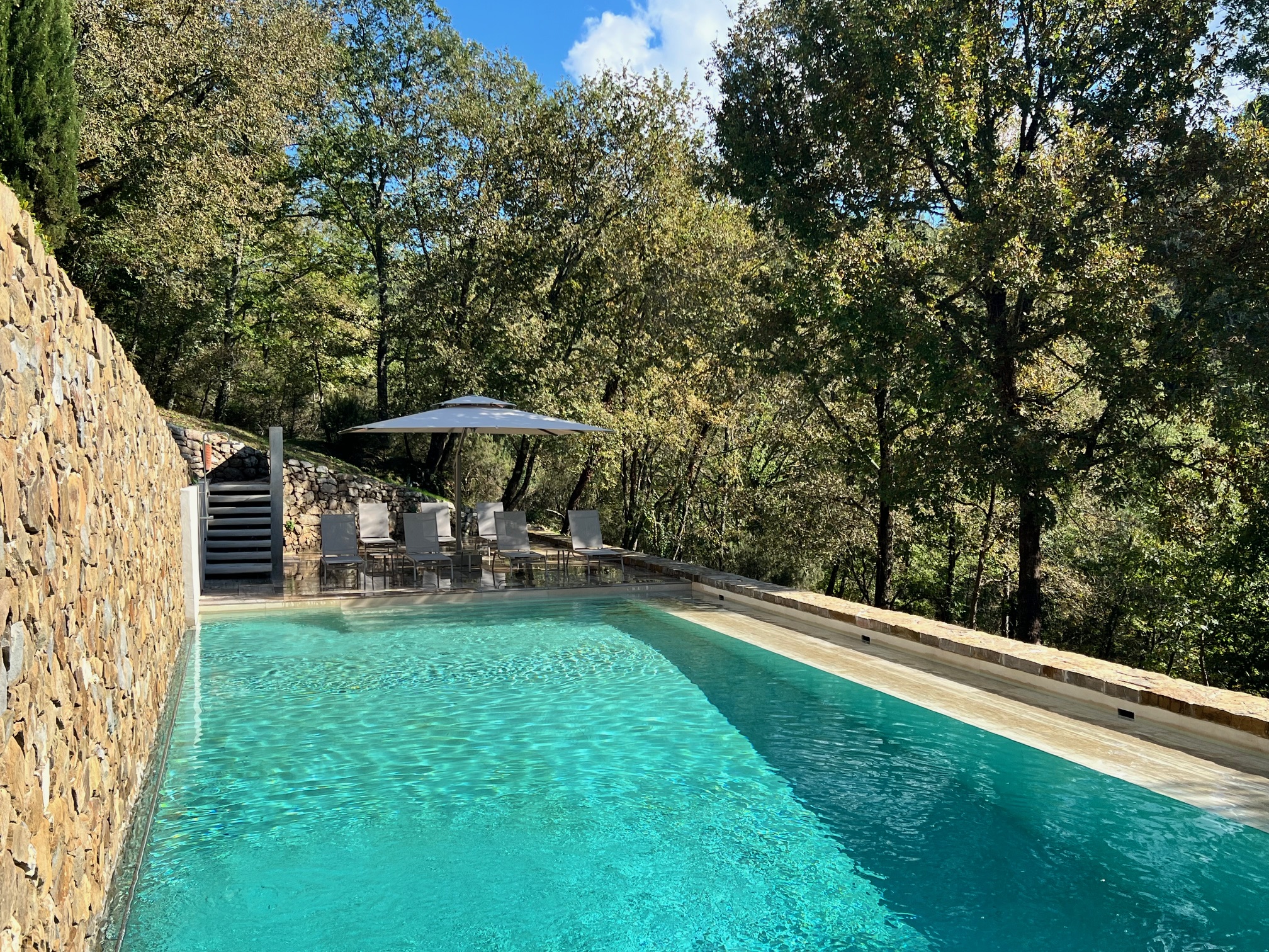 In 2024, we undertook a complete 9-month renovation of the pool and its surroundings. We resurfaced the pool’s interior and seating terraces with beautiful noce travertine and Thalia beige tile and added a second seating terrace at the deep end. We integrated a pool-side shower into the stone wall and installed new lighting. We sourced all new furnishings adding more lounge chairs along with side tables and an extra-large 3m x 4m Poggesi umbrella.