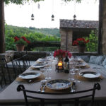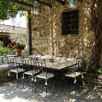 There are two outdoor dining areas: one just outside the kitchen door under a beautiful wisteria arbor overlooking the formal garden of boxwood and lavender and the other in the protective shade of the entry portico – providing the option to eat outside no matter what the weather. A family of swallows (“rondine” in Italian) nest in the beams of the entry portico, considered a sign of good luck for the house.